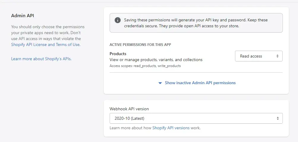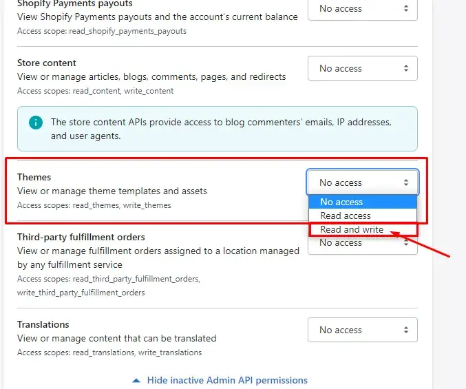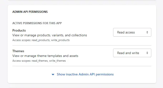 Scroll down to the Admin API section and give read and write permissions to Themes.