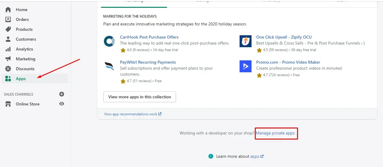 Click on the Apps menu and open the Manage private apps link, located at the last of the page.